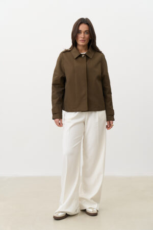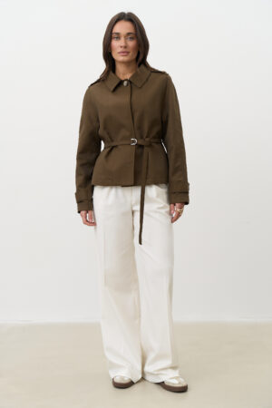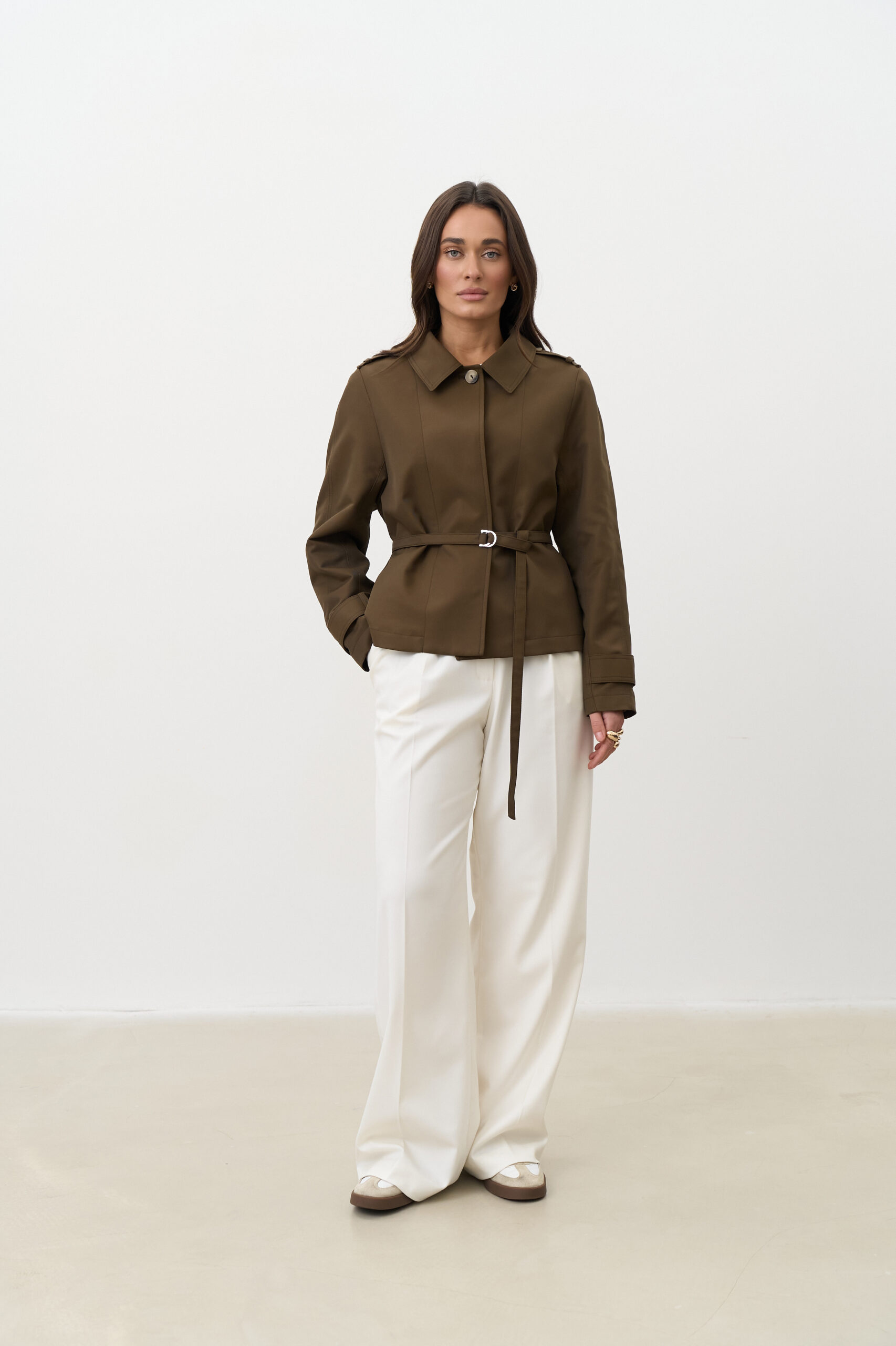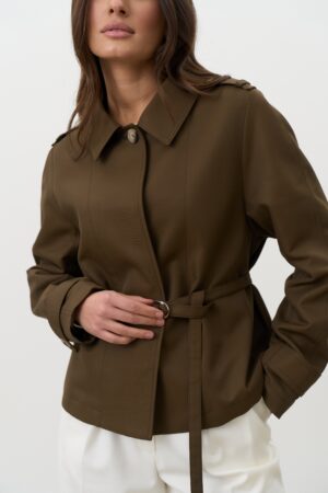 Вкорочений тренч має приталений силует, який підкреслює талію та створює гармонійні пропорції. Довжина виробу — 58 см, що робить модель універсальною для поєднання з брюками, джинсами, спідницями та сукнями.