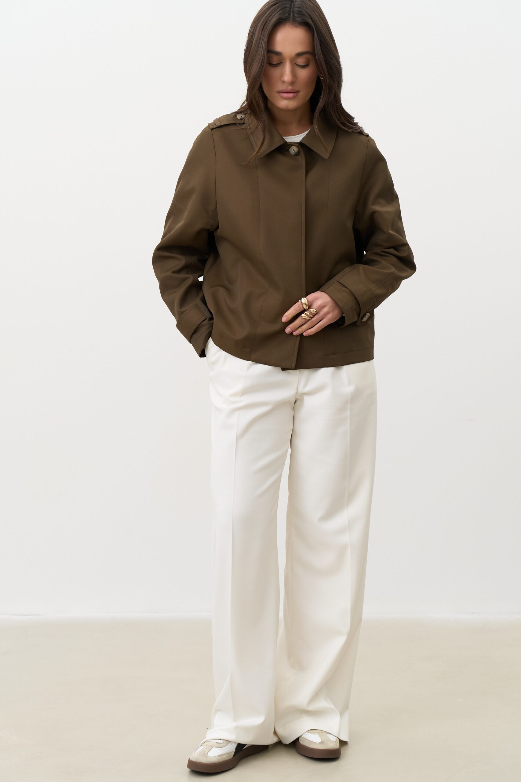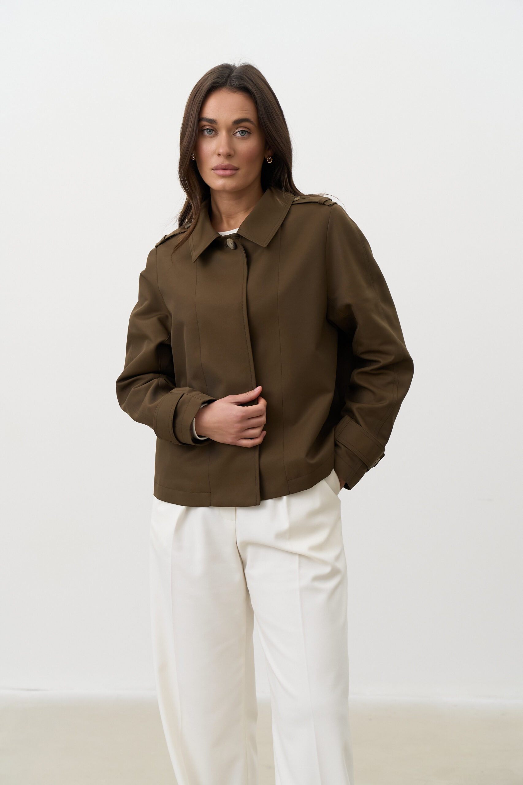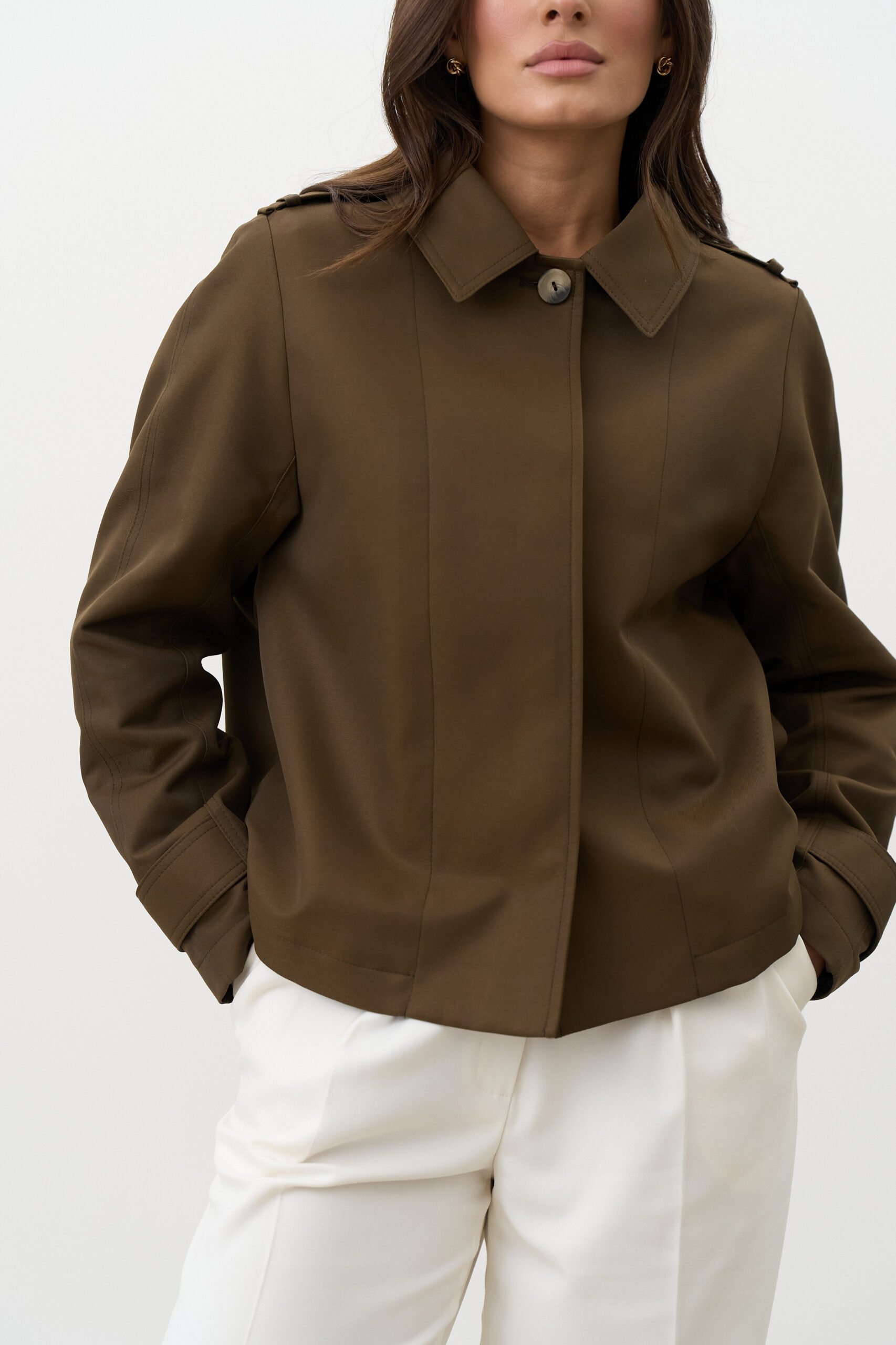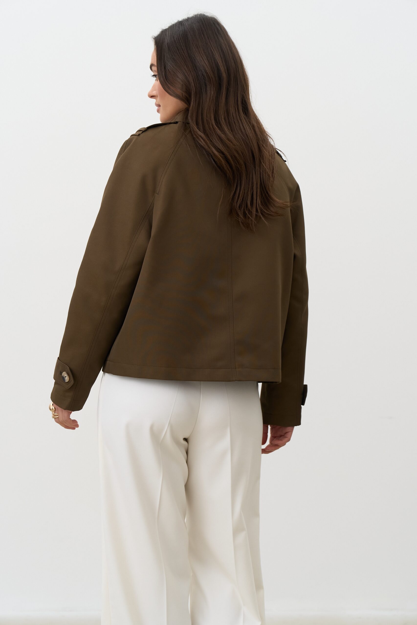 Вкорочений базовий тренч кольору табак — тепла глибина та характер у кожній деталі
