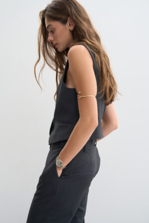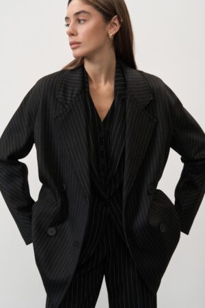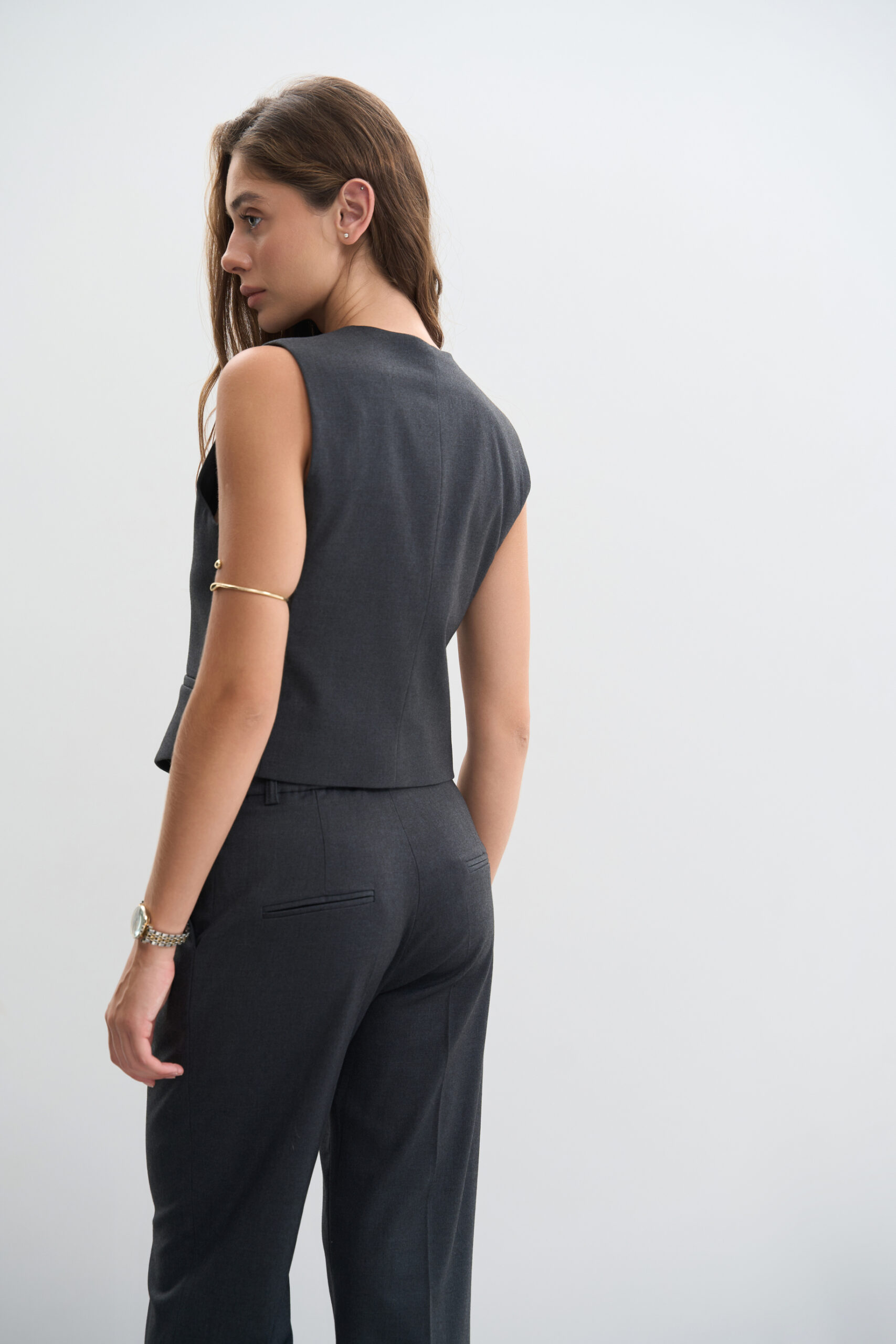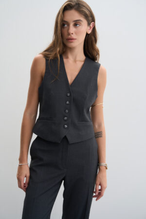 Ця жилетка має класичний крій, який забезпечує стильну та зручну посадку. Чорний колір додає жилетці універсальності, дозволяючи легко поєднувати її з різними елементами гардероба. Класичний крій ідеально підходить для створення як ділових, так і повсякденних образів.