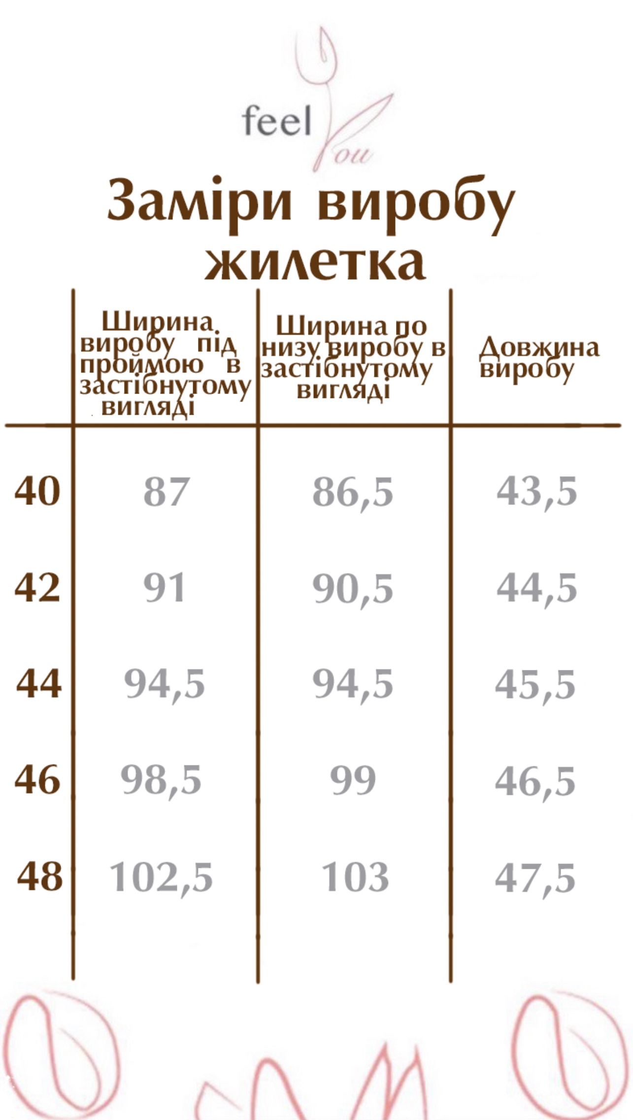 - Прасування: для збереження форми та якості матеріалу рекомендується прасувати жилетку з внутрішнього боку при низькій температурі.