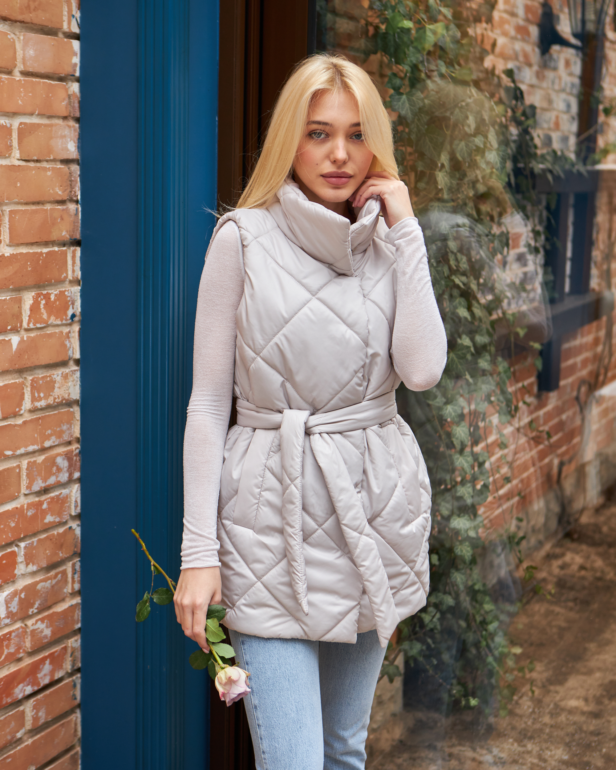 Прямий і вільний крій жилетки робить її зручною для носіння, а легкий оверсайз додає сучасного вигляду. Стьожка у вигляді ромбів додає жилетці стильного вигляду. Комфортний комір захищає від вітру, а вмісткі кишені дозволяють зручно зберігати необхідні дрібниці.