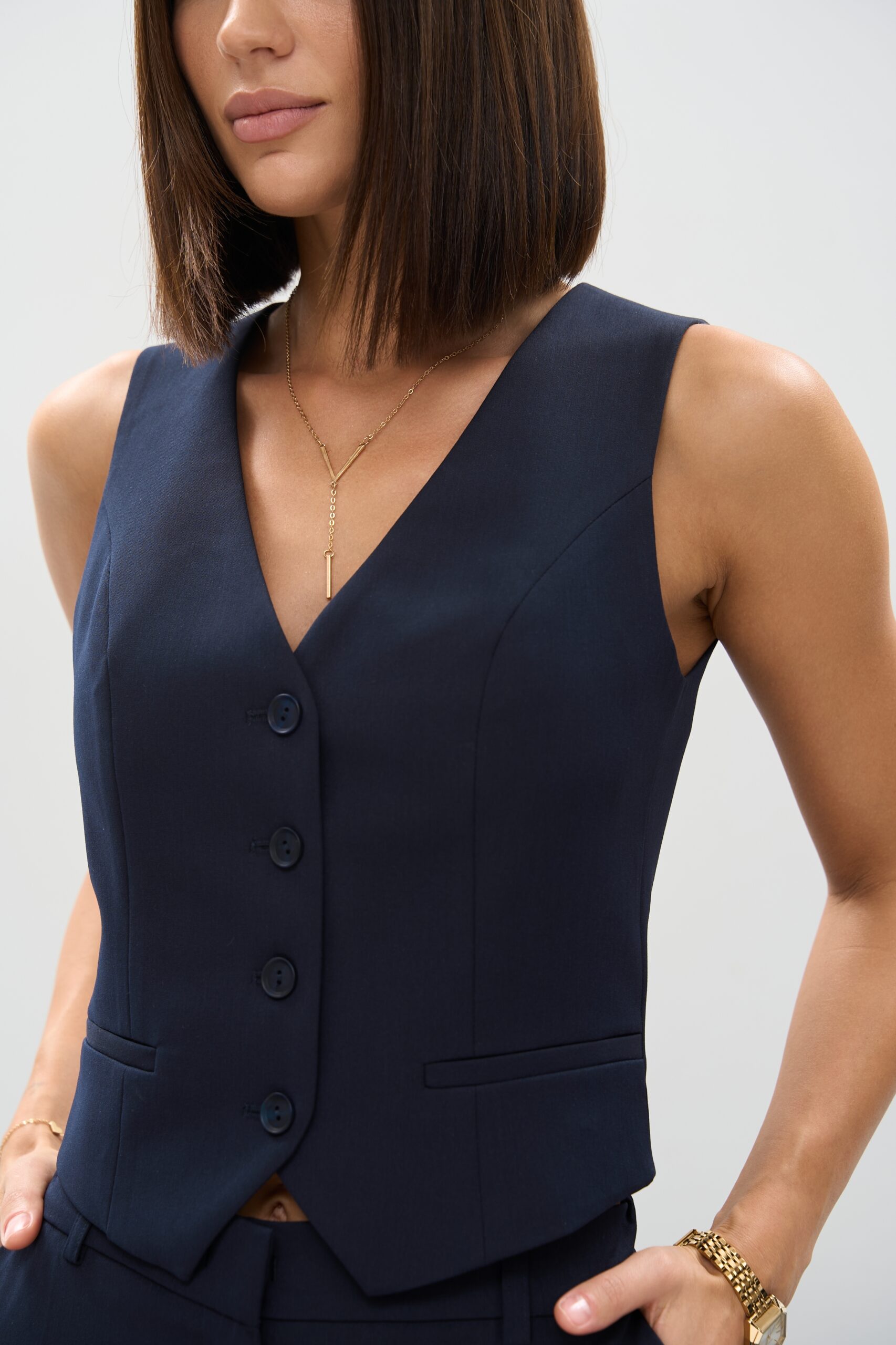 Стильні ґудзики підкреслюють класичний характер жилетки.